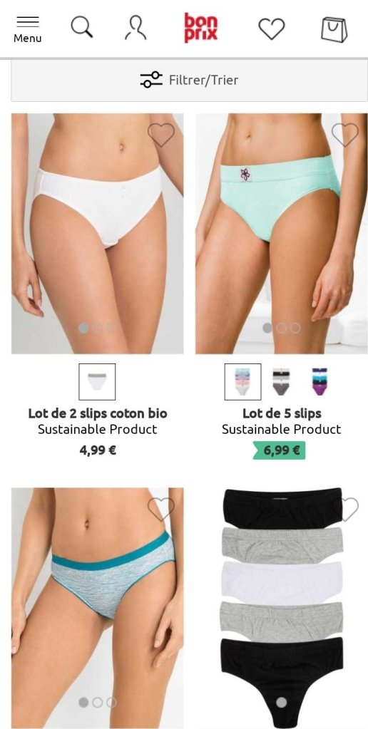 Le site Bonprix est un site internet sur lequel vous pouvez trouver des sous-vêtements en coton de la taille XS jusqu’à la taille 60, à petits prix, des culottes en coton taille haute et taille basse, éco-responsable, tous type de motifs.