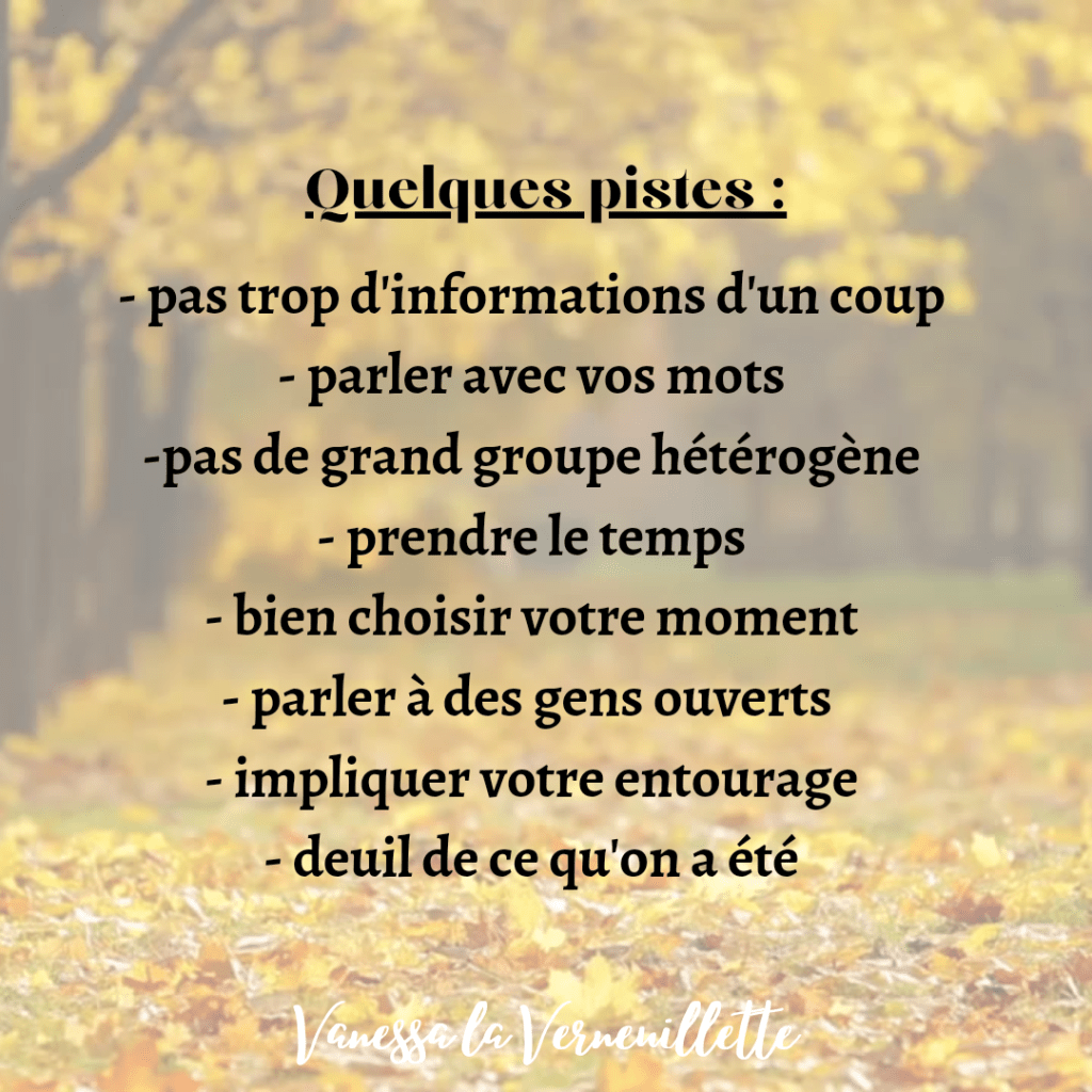 De plus, en vous précipitant pour parler alors que vous ne l’avez même pas encore vous-même intérioriser, vous n’aurez pas le recul nécessaire pour poser vos mots. Et si vous ne l’acceptez pas vous-même comment votre entourage pourrais l’accepter ?