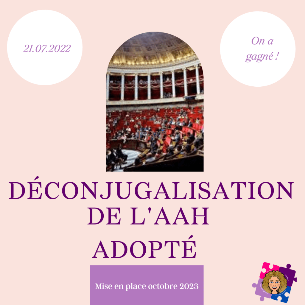 L’Assemblée nationale a voté à l’unanimité moins une voix dans la nuit du mercredi 20 au jeudi 21 juillet 2022 la déconjugalisation de l’allocation adulte handicapé (AAH), en adoptant des amendements déposés par tous les groupes, après plusieurs refus de l’exécutif lors de la précédente législature.