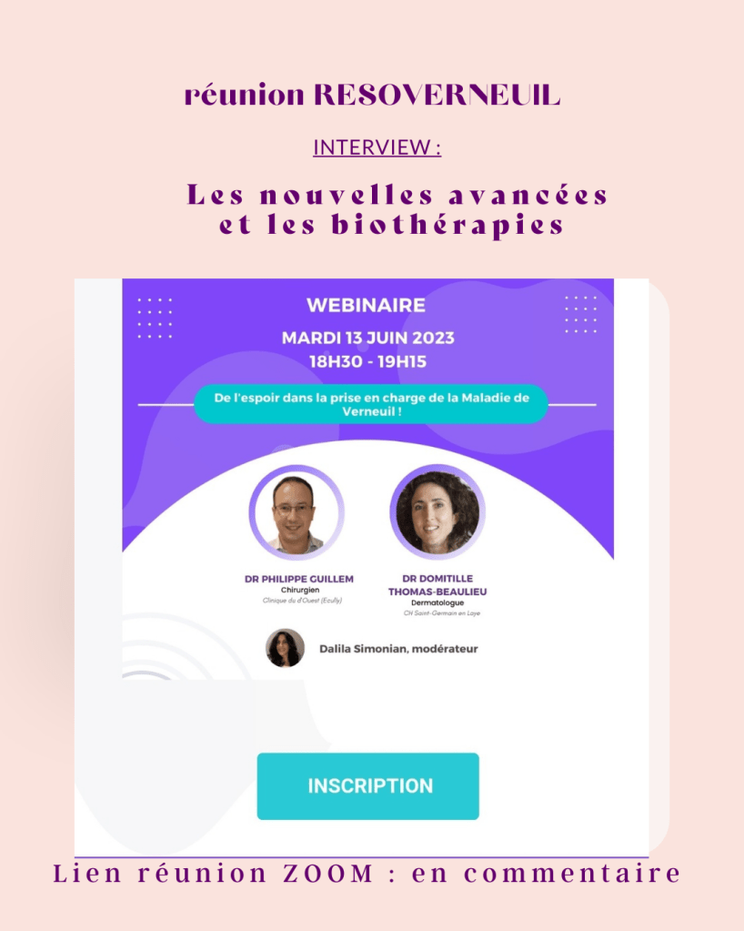Pour vous inscrire gratuitement, copiez le lien suivant : https://app.livestorm.co/reso-1/de-lespoir-dans-la-prise-en-charge-de-la-maladie-de-verneuil-1