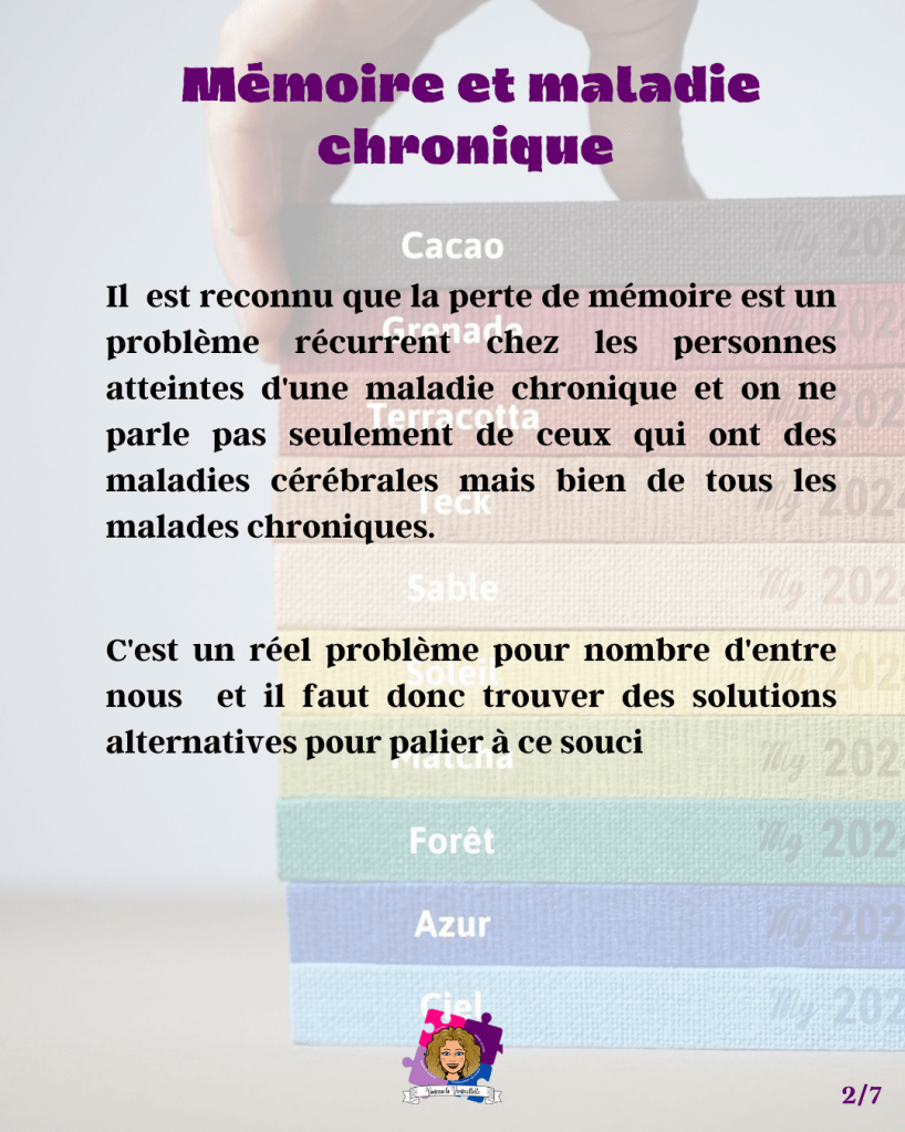 Mais il ne faut pas négliger les personnes atteintes de perte de mémoire qui peuvent être tout simplement liées aux effets secondaires des médicaments utilisés pour traiter une maladie ou encore une fatigue mentale liée aux douleurs physiques et/ou morales de notre pathologie. Nous le savons, que ce soit la maladie de Crohn, la maladie de Verneuil, les maladies rhumato ou autres, elles ont un impact au quotidien sur notre vie et la lourdeur de ces pathologies peut être, au-delà de la frustration, une problématique dans notre vie au quotidien.