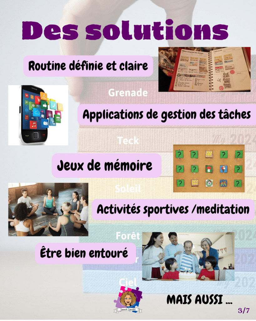 L’utilisation de jeux de mémoire, stratégies mnémoniques peut également faciliter la mémorisation. Par exemple, associer des images mentales ou créer des acronymes pour retenir des informations clés peut aider à compenser la perte de mémoire. Ils peuvent également aider à stimuler le cerveau et améliorer la mémoire tout en distrayant et en vous amusant.