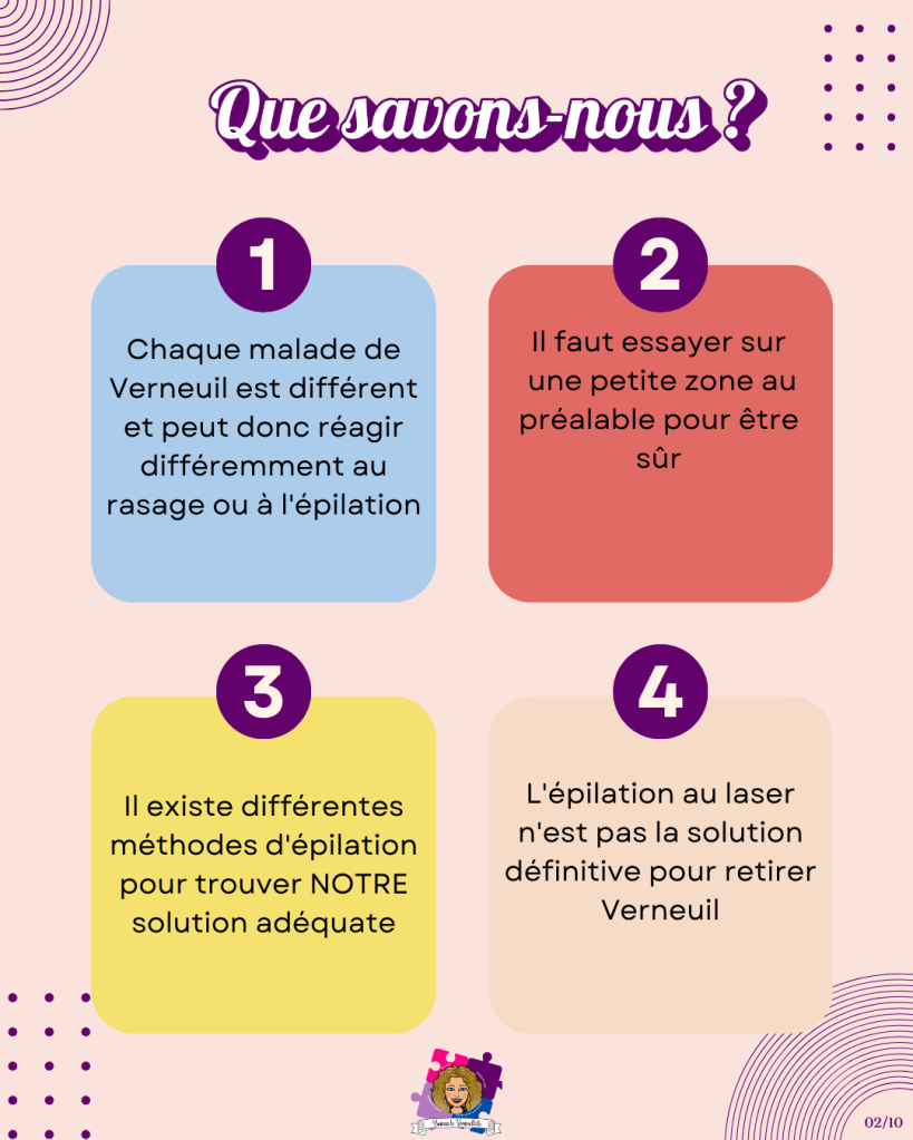 On sait que les « principales » localisations de la maladie de Verneuil concernent « essentiellement » les zones pileuses riches en glandes sudoripares (glandes produisant la sueur), mais pas que. Et donc le malade peut être plus ou moins gêné au niveau de sa pilosité et par extension avoir beaucoup de difficulté par la douleur à s’épiler.