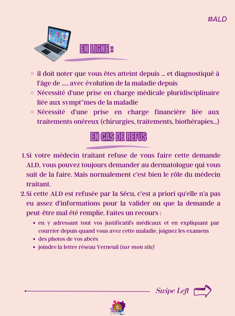 Depuis que je suis très active sur les réseaux, je me rends compte que beaucoup de gens pensent encore que la maladie de Verneuil n’est pas prise en charge à 100% . Et c’est totalement faux ! Depuis février 2004, la maladie de Verneuil est reconnue comme une affection de longue durée.