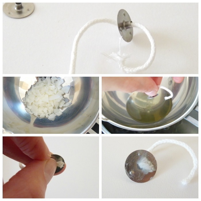 1. lissez la mèche dans le support métallique et pincez-le avec une paire de ciseaux pour fixer la mèche au support. Faites chauffer les copeaux de cire au bain marie. Lorsque la cire est liquide, plongez  le support métallique avec le bout de mèche et rabattre le bout de la mèche sur le support de sorte à ce qu’il colle au support. Replongez ensuite la mèche et donnez lui une forme bien droite puis laissez sécher.